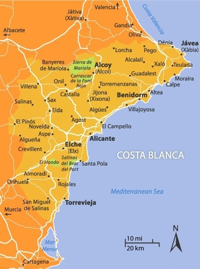 Het massatoerisme vindt u hier niet, met uitzondering van de plaats Benidorm die al jarenlang een van de meest bekende vakantiebestemmingen van Spanje is met haar uitgestrekte wandelboulevards.